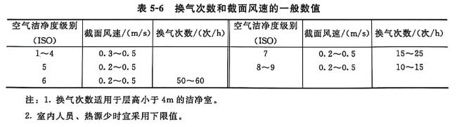 表5-6是ISO14644一4主要針對微電子工業(yè)潔凈室給出,被我國GB500732001<<潔凈廠房設(shè)計規(guī)范>>等同采用的換氣次數(shù)與截面風(fēng)速數(shù)值,當(dāng)沒有具體標(biāo)準(zhǔn)時可以參考,其中風(fēng)速更應(yīng)參照第四章介紹的下限風(fēng)速。