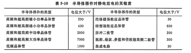 2.靜電放電引起的放電電流,可導致諸如半導體元件等破壞和誤動作,例如將50塊P-MOS電路放在塑料袋內(nèi),搖晃數(shù)次后,與非門柵嚴重擊穿者計39塊,失效率竟達78%,這是因為半導體器件對靜電放電十分靈敏,見表5-10;