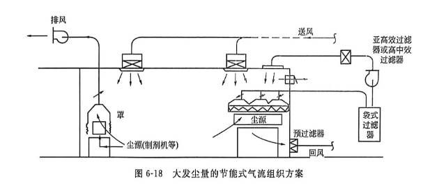 圖6-18是對發(fā)塵量大的和排氣量也大的塵源用罩子和管道先把含塵空氣集中處理之后再循環(huán)的做法,如果全部排至室外,能量浪費太大。
