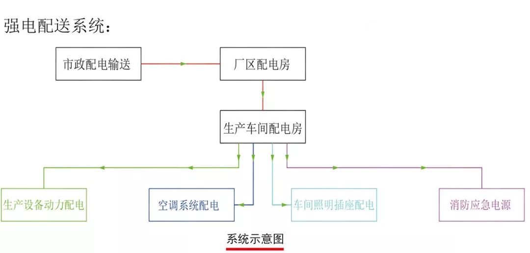 強(qiáng)電配送系統(tǒng)是指將市政供電網(wǎng)通過廠區(qū)變配電房,配電房將電力輸送到各個車間,并在此配送到各個需求點(diǎn)。主要包括生產(chǎn)動力配電、空調(diào)系統(tǒng)配電、車間照明插座配電及消防應(yīng)急配電。通過強(qiáng)電網(wǎng)的敷設(shè),使各個車間的功能能夠逐步完成正常的生產(chǎn),不影響人們的工作生活。