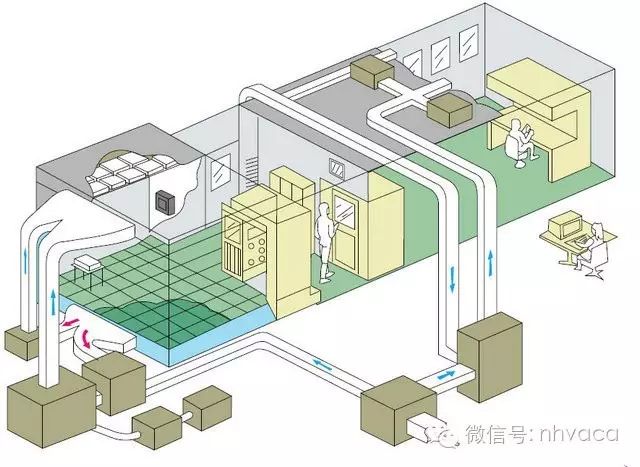 在一定空間范圍內(nèi),將空氣中的微粒子、有害空氣、細(xì)菌等污染物排除,并將室內(nèi)溫度、潔凈度、壓力、氣流速度與氣流分布、噪音振動(dòng)及照明、靜電控制在某一需求范圍內(nèi)的工程學(xué)科。氣流→初效凈化→加濕段→加熱段→表冷段→中效凈化→風(fēng)機(jī)送風(fēng)→管道→高效凈化風(fēng)口→吹入房間→帶走塵埃細(xì)菌等顆?!仫L(fēng)百葉窗→初效凈化重復(fù)以上過程,即可達(dá)到凈化目的,即為凈化空間。