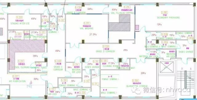 從D級(jí)走廊到C級(jí)走廊,依次絕對(duì)壓差為 25Pa、30Pa、35Pa、40Pa、45Pa,設(shè)計(jì)理由同一般區(qū)進(jìn)入D級(jí)區(qū),都是為了保證一個(gè)叫合理的壓差梯度,同時(shí)C級(jí)走廊對(duì)D級(jí)走廊相對(duì)壓差大于20Pa,即使C級(jí)氣閘間對(duì)于C級(jí)更鞋也有15Pa,符合法規(guī)要求的大于10Pa的規(guī)定。